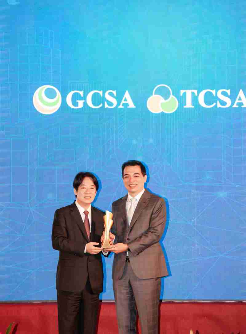 达全方位永续表现获全球永续奖及台湾永续奖肯定,,由副总统赖清德颁奖 (左),,巨星国际总经理柯富仁 (右) 代表领奖