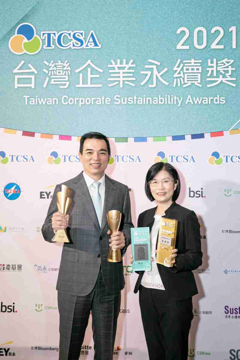 达在台湾永续奖所评比环境、、社会、、、、治理等各面向的永续绩效均获高度肯定 (左:巨星国际光电总经理暨营运长柯富仁,,,右:巨星国际光电永续长古秀华)