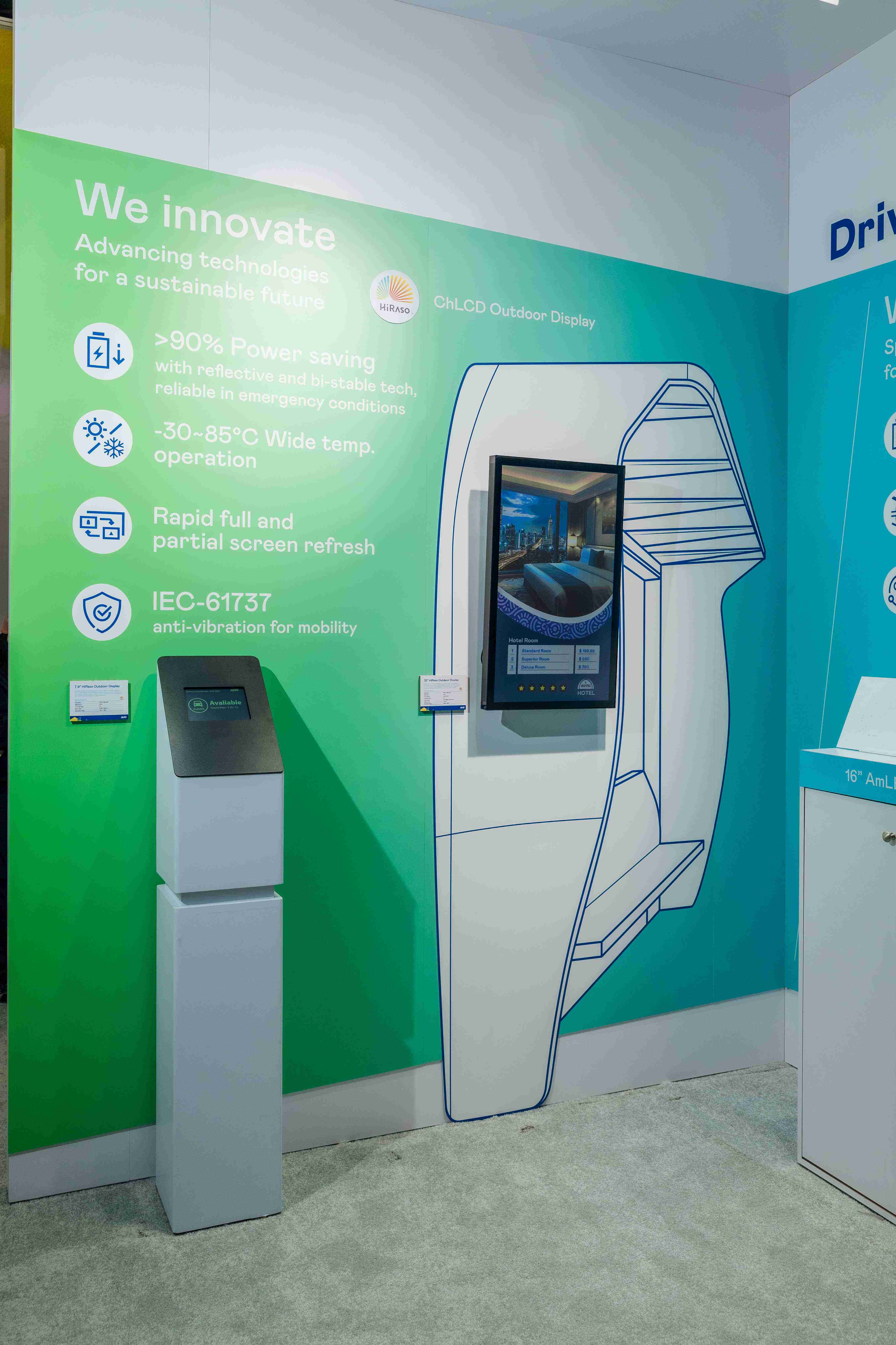 HiRaso胆固醇液晶显示器运用反射环境光线的方式,,,呈现影像显示时零耗能的环保省电诉求,,,光线愈强愈能呈现绝佳的色彩饱和度及显示效果,,同时在摄氏-30度至85度间宽温的使用优势,,,为户外电子看板的新首选。。