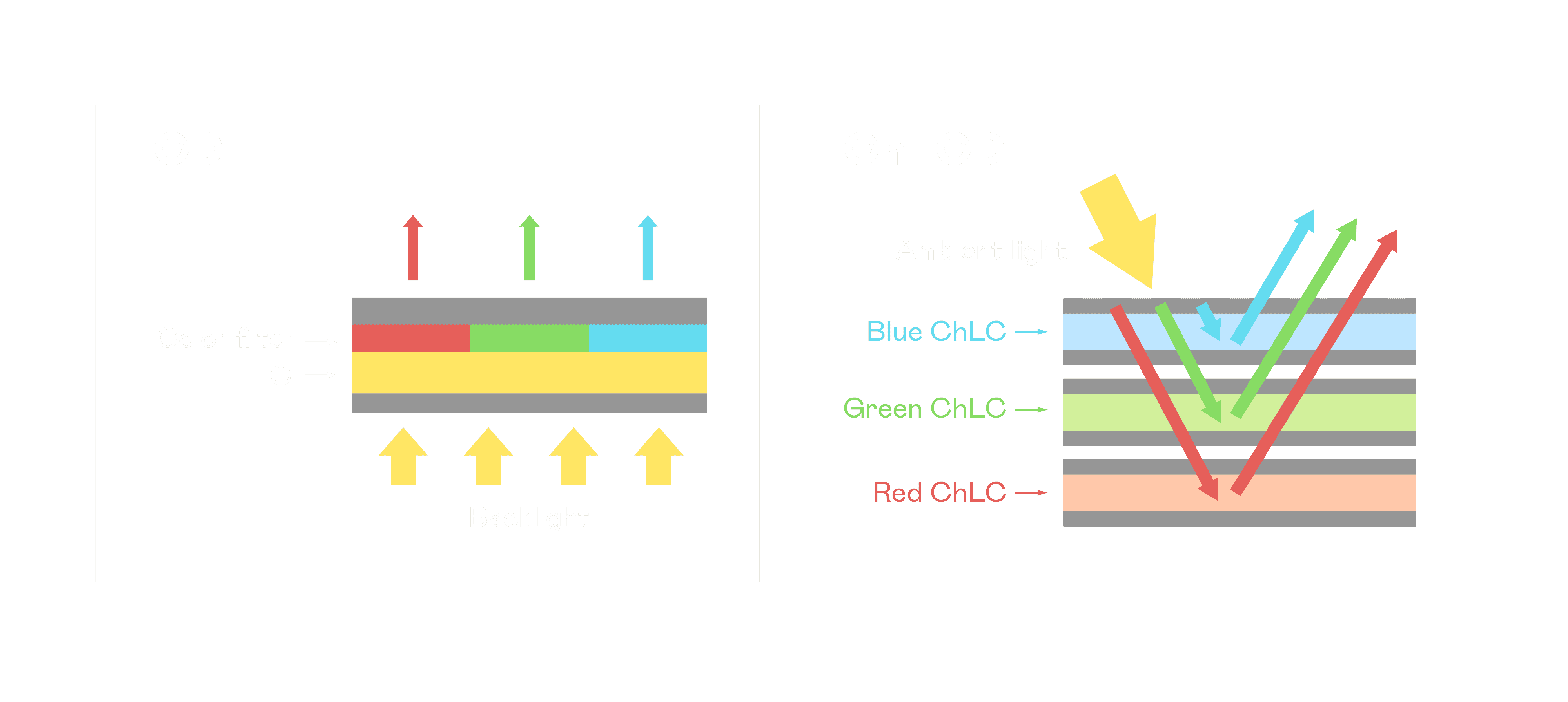 ChLCD 胆固醇液晶就如同纸张一样,,,,透过反射环境光来显示影像,,,,因此长时间观看不易造成人眼视觉疲劳,,,可达到护眼效果。。当处于户外阳光下使用,,LCD 影像容易失真而不易观看,,但胆固醇液晶仍可维持较佳的影像品质。。