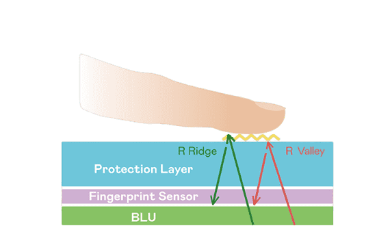 TFT 指纹扫描感测技术利用薄膜电晶体 (TFT) 当作光感测元件,,藉由非晶硅 (a-Si) 与低温多晶硅(LTPS)既有光电转换特性对不同波段光源进行吸收,,使感测 IC 读取阵列感测元件的光漏电差异,,,,转换成数位灰阶影像。。。