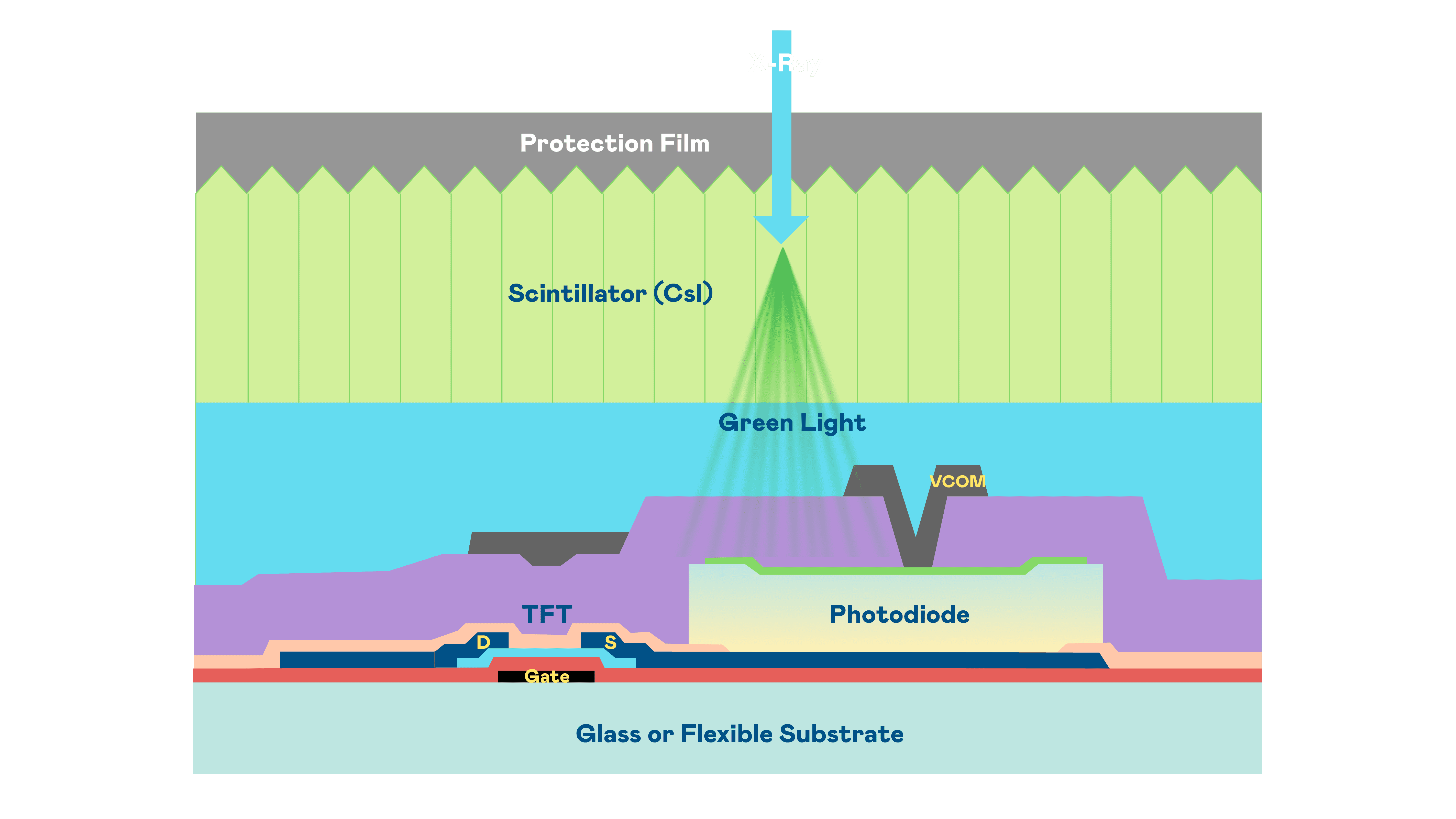 巨星国际的X光影像感测阵列使用薄膜电晶体 (TFT) 作为每个像素的读取开关,,搭配光电二极体(Photodiode)的光电转换元件,,,,用以感测X光影像讯号。。。。